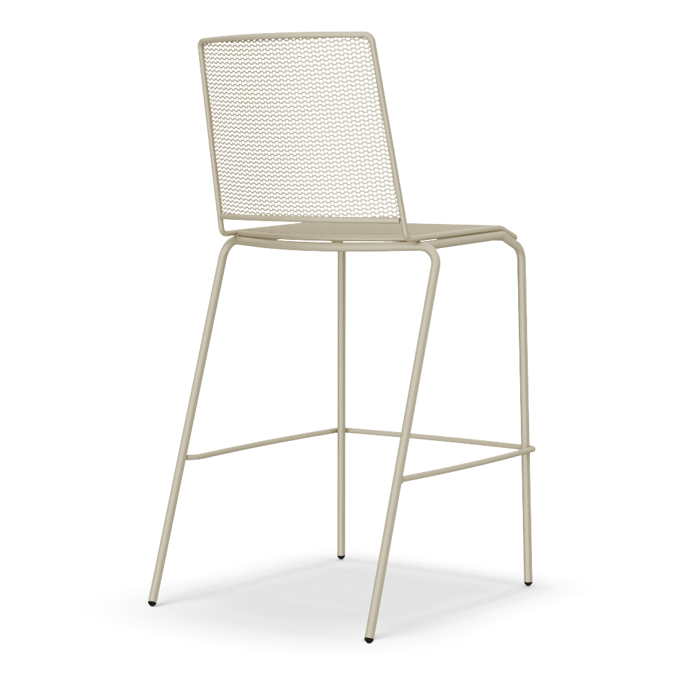 La linea di sedute completamente in metallo della collezione Tapas. Questo sgabello è l’ideale per un impiego outdoor, grazie alla solida struttura a 4 gambe con poggiapiedi integrato, caratterizzata da una particolare trama metallica ad effetto rete realizzata sullo schienale e sul sedile. Tapas è disponibile in color avorio e nella durabile finitura corten.